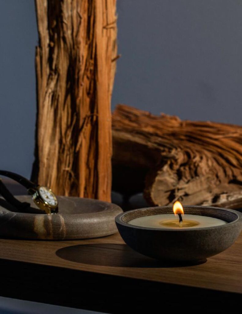 Coleção veio ousar. Objetos em madeira carbonizada, a mesa colocada como joia, lugar de encontros e partilhas